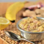 The fruity flavour and gingery zing of this unusual chutney make it an excellent complement to creamy South Indian and Thai coconut curries. It’s the perfect way to use up three ripe bananas.