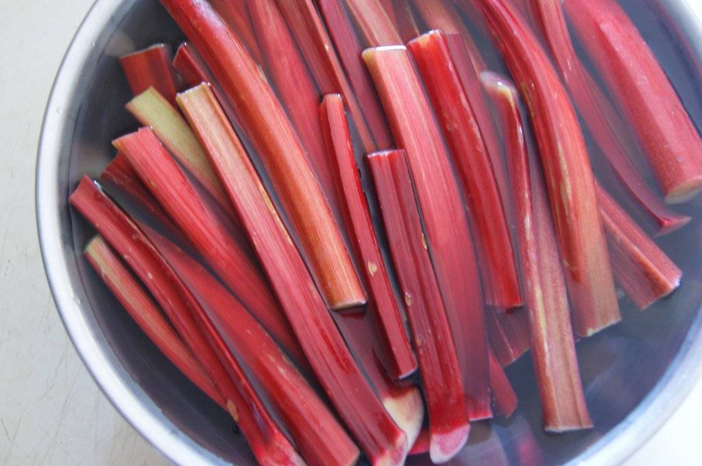Trim green ends off rhubarb and wash the stalks well. If desired, place the trimmed stalks in cold water to soak for 10 minutes. This an old British culinary trick to help remove some of the acid from the rhubarb. I’ve yet to determine the efficacy of this trick, but I do it anyway.