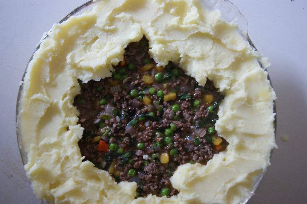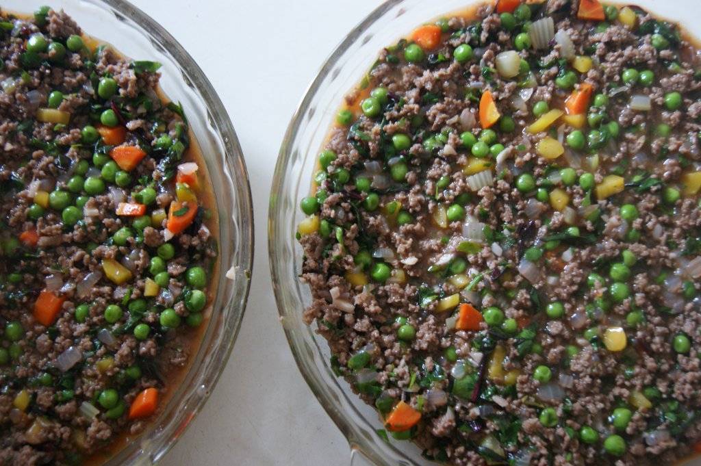 6. Stir the peas into the lamb/mutton mixture. Taste mixture for seasoning. You may want more salt, soy sauce, pepper, etc. Divide the lamb mixture evenly between two 9-inch deep-dish pie pans (the glass ones are great for this). Now dollop 1/4 of the mashed potatoes around the outside of each pan and smooth it out, anchoring it to the edge of the pie pan, like so: