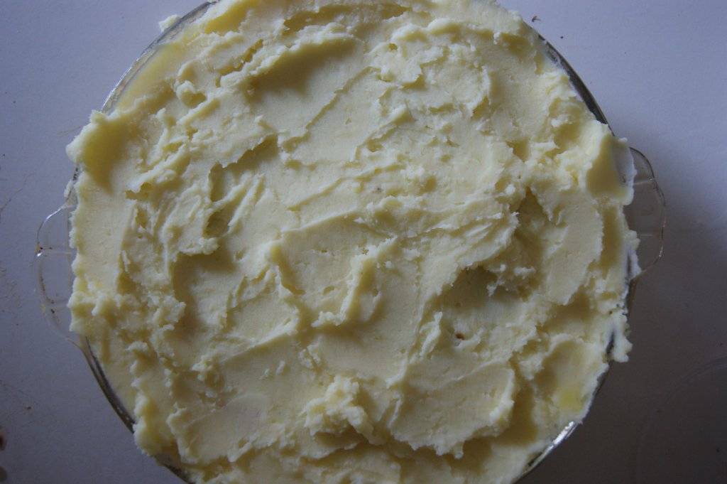 7. Finally, divide the remaining mashed potatoes between the middles of the two pans, and working from the outer circle of potato, spread it to over the meat mixture evenly.
